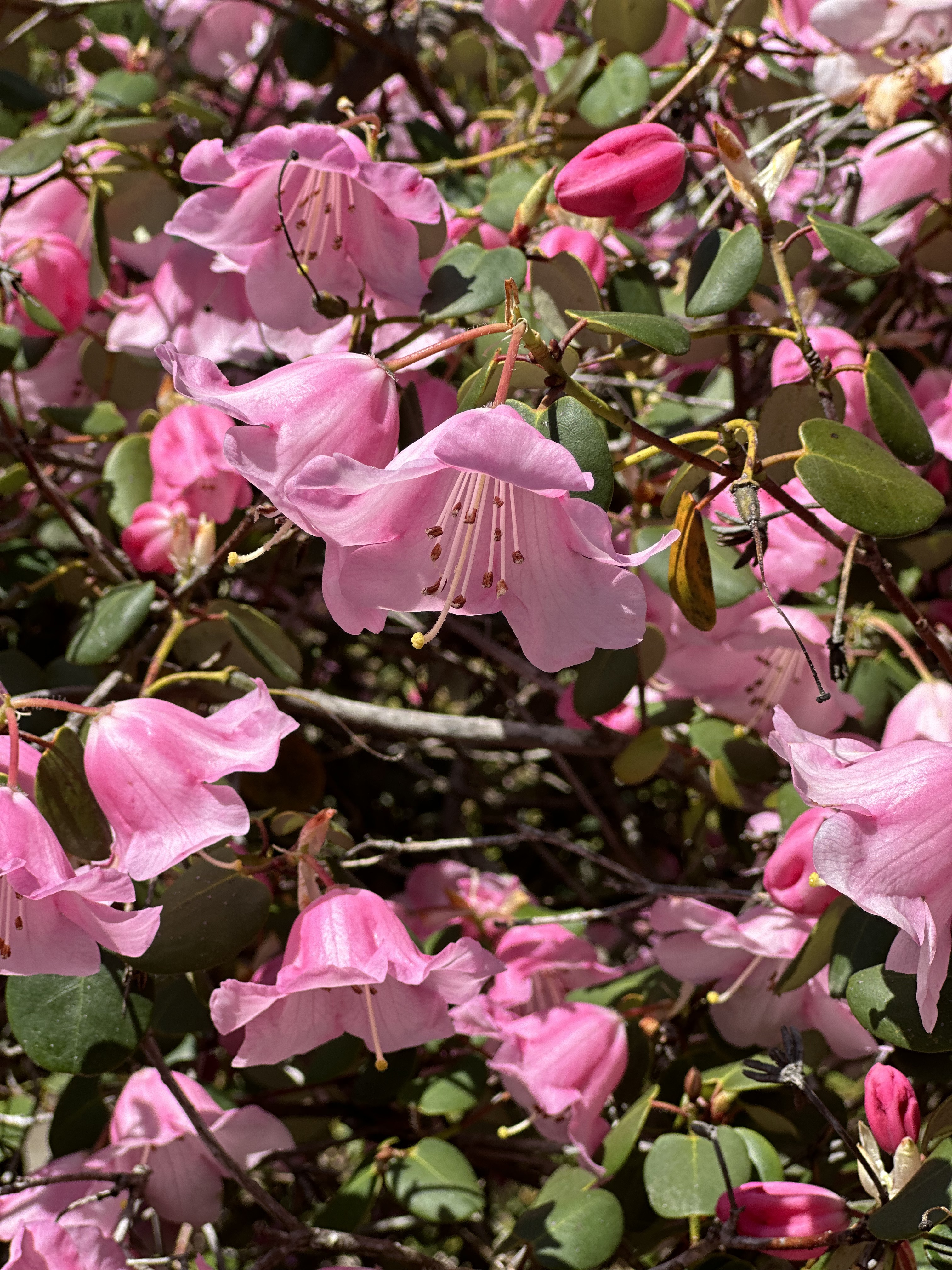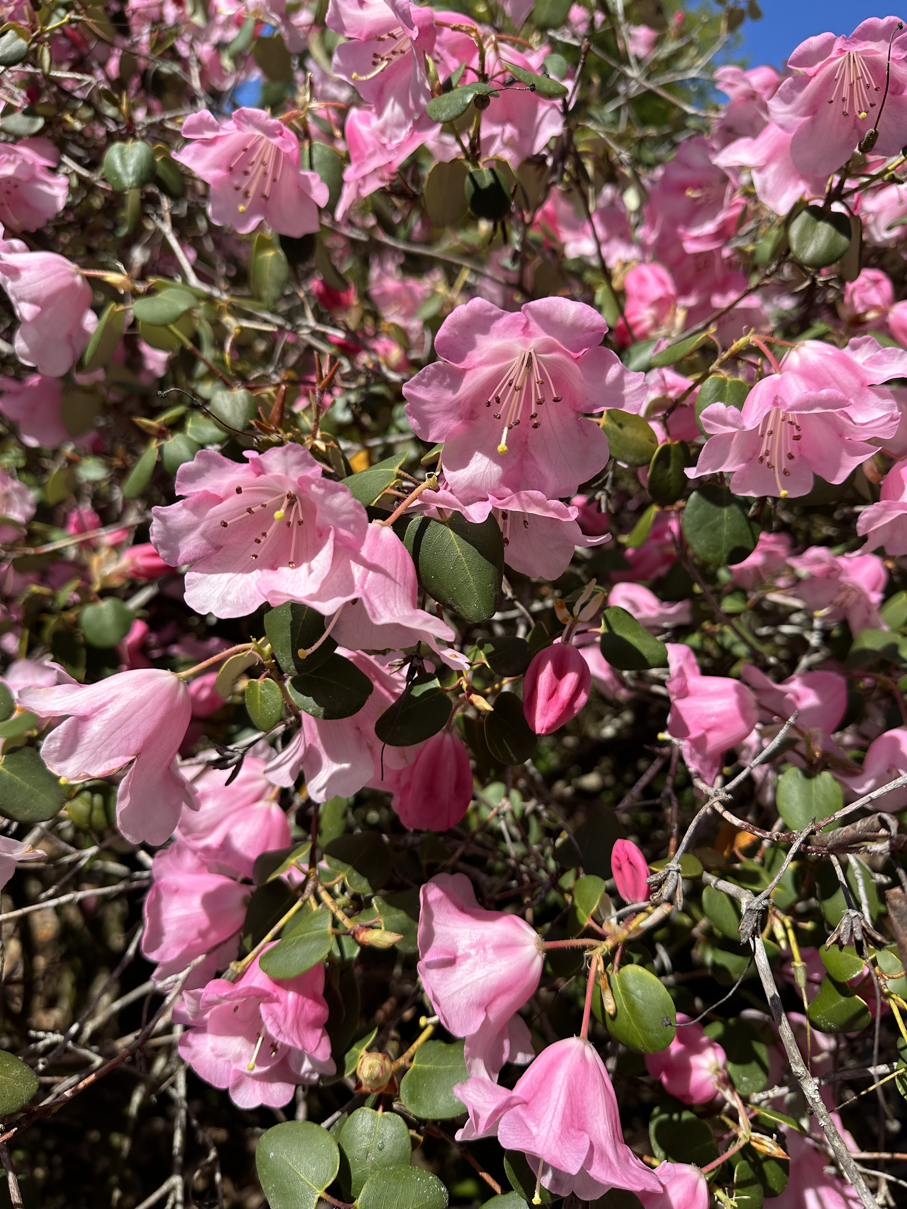“No, I shouldn’t think so.” I reply, dismissively. It doesn’t look at all like a Rhodo. The flowers are like single bells on the end of thin branches, not the big showy mop of flowers of the Rhodos.