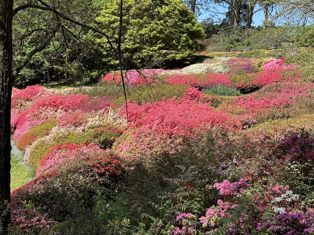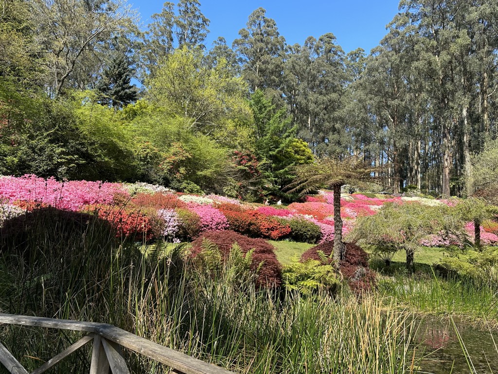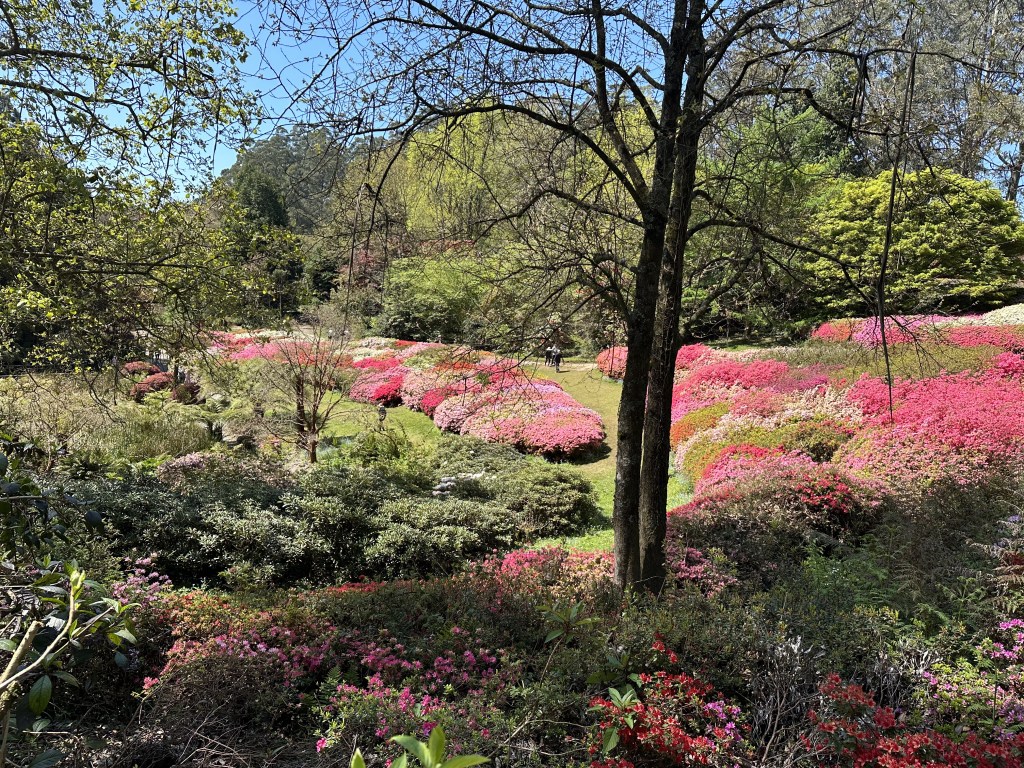 We’ve taken a different route today than our usual one, but return, as always, by the same path to get the best view of my favourite section of the gardens – The Kurume Bowl. As the name suggests, it’s a bowl shaped hillside, with tier upon tier of brightly coloured azaleas leading down to an ornamental lake. I take more photos, bemoaning what a frightful photographer I am. The photos really don’t do it justice.